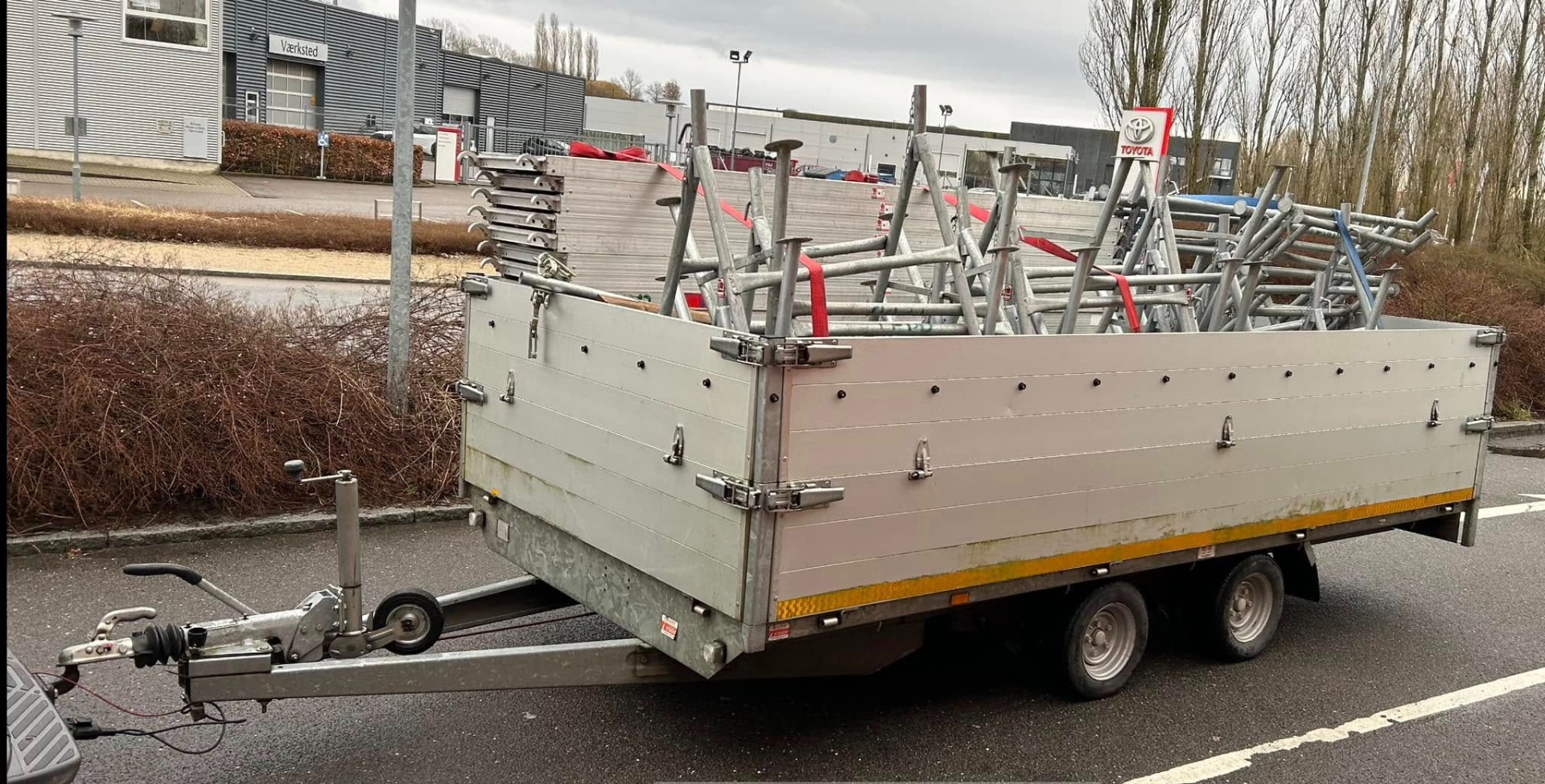 Komplet bukkestillads 30 M x3, med forhøjer og rækværk. Enkelt stillads kan aftales. Udlejes i minimum 2 dage.